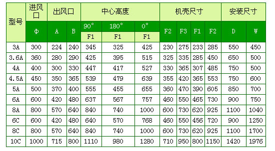 A式為葉輪和電機(jī)直聯(lián),C式二種,900轉(zhuǎn)-1250轉(zhuǎn)為軸座傳動,1250轉(zhuǎn)-1600轉(zhuǎn)為軸承箱傳動